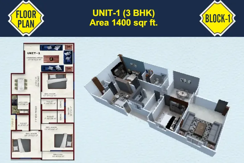 | 3 BHK | 1400 Sq.Ft | |