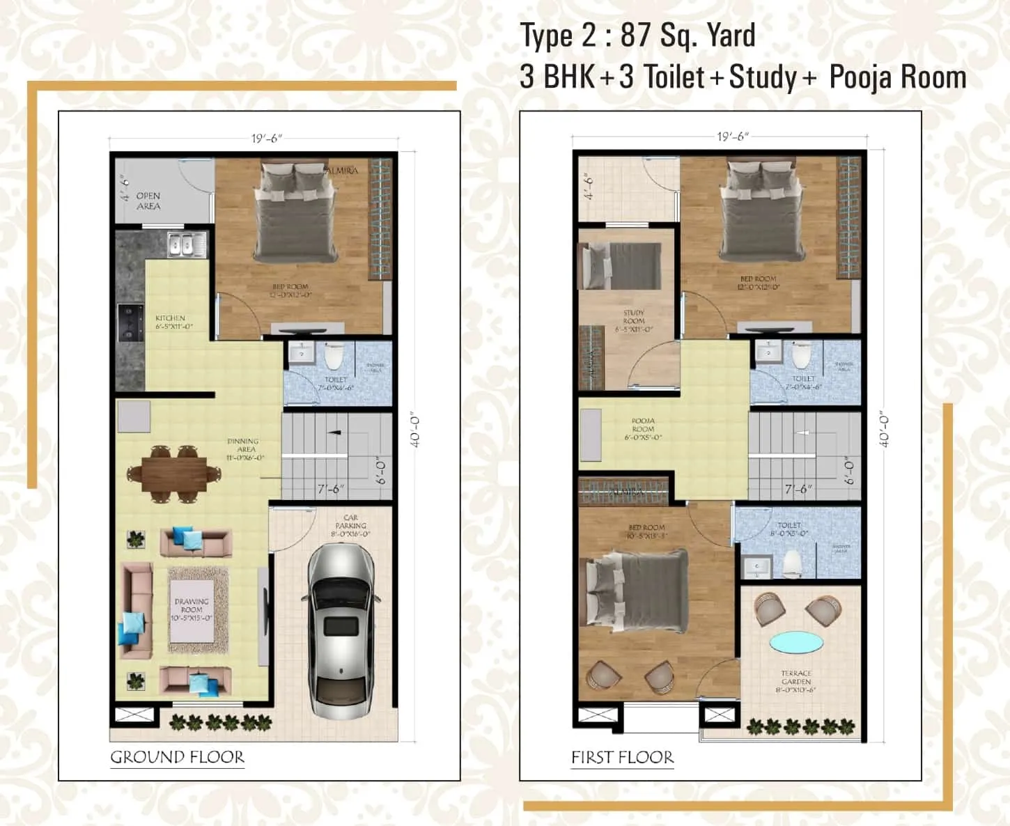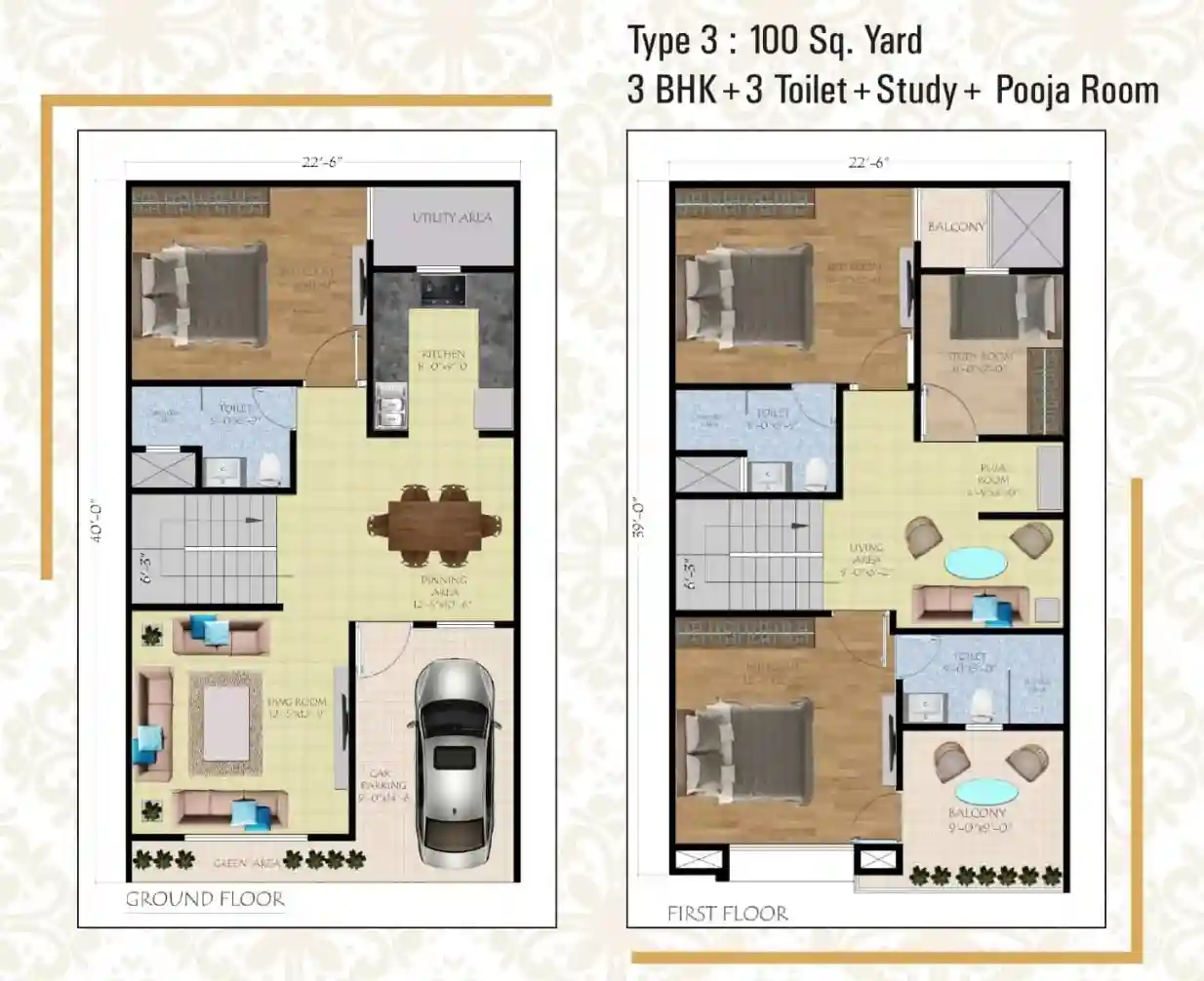 | 3 BHK + 3T + Study | 100 Sq.Yd | |