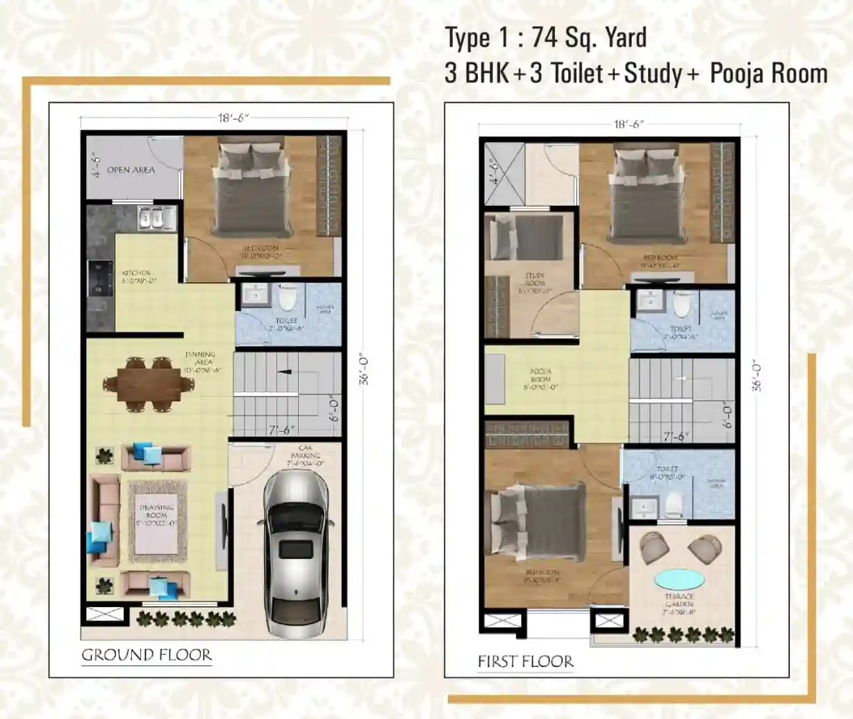 | 3 BHK + 3T + Study | 74 Sq.Yd | |