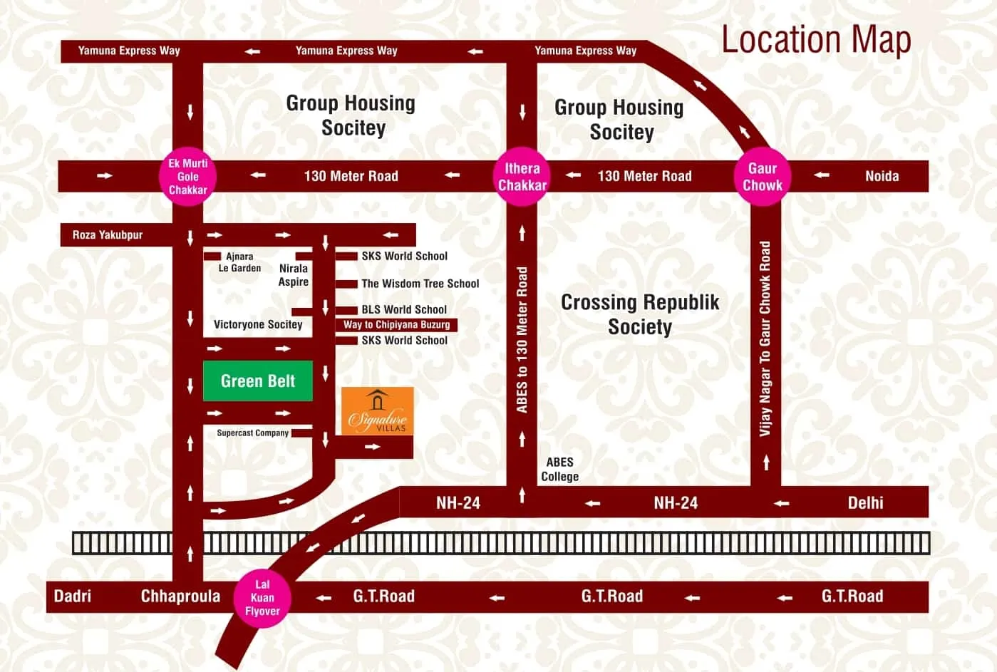Signature Villas Location in Sector 16B, Noida Extension, is strategically positioned for easy access to main roads, IT hubs, schools, hospitals, and retail outlets. The development also benefits from its nearness to Noida-Greater Noida Expressway and future metro routes, which will not only make daily commuting convenient but will also add to the property value in the long run.